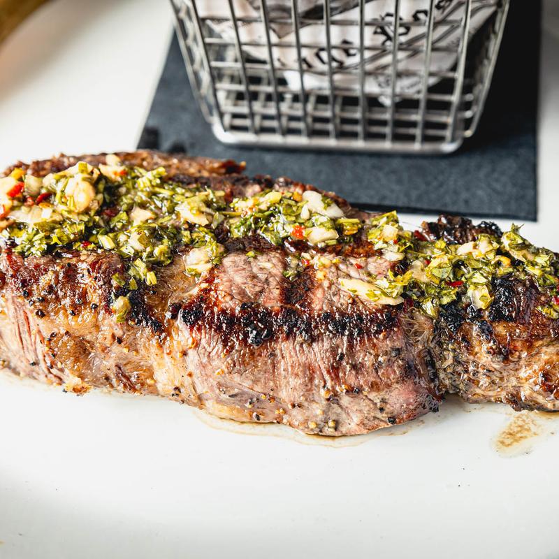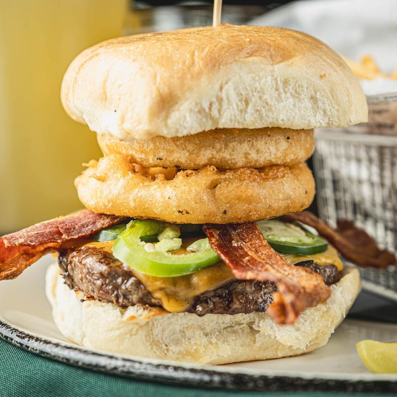 American kobe beef, onion ring, bacon, cheddar cheese, BBQ sauce, jalapeño, french fries.