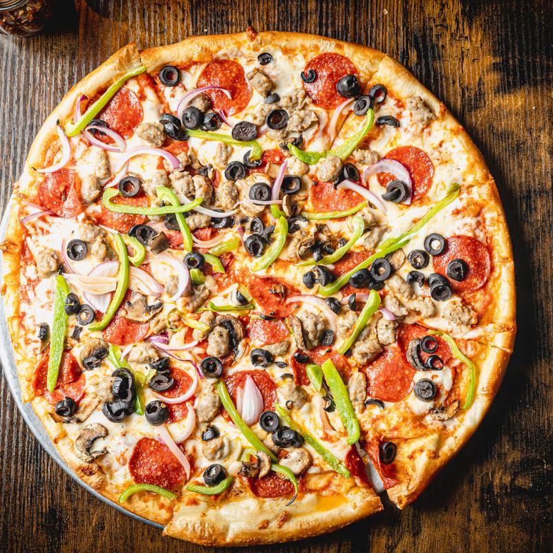 Pepperoni, sausage, bell peppers, onions, olives, mushrooms, mozzarella, parmesan, tomato sauce.