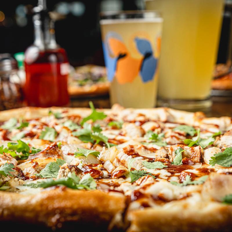 BBQ sauce, roasted chicken, mozzarella, onions, cilantro, tomato sauce.